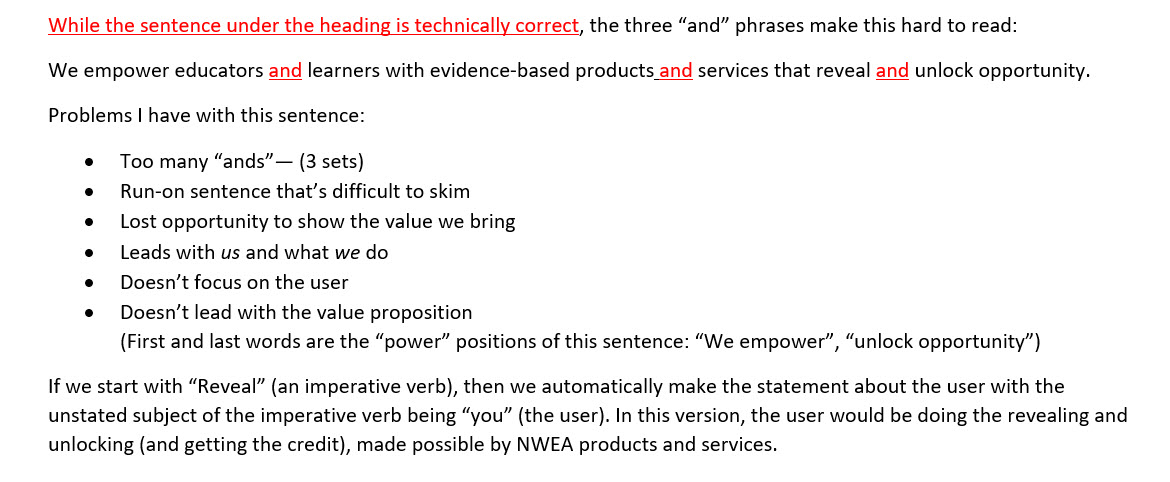 - Review for clarity, consistency, voice, tone, accessibility, inclusivity, impact, reading level, punctuation, spelling, style, grammar.