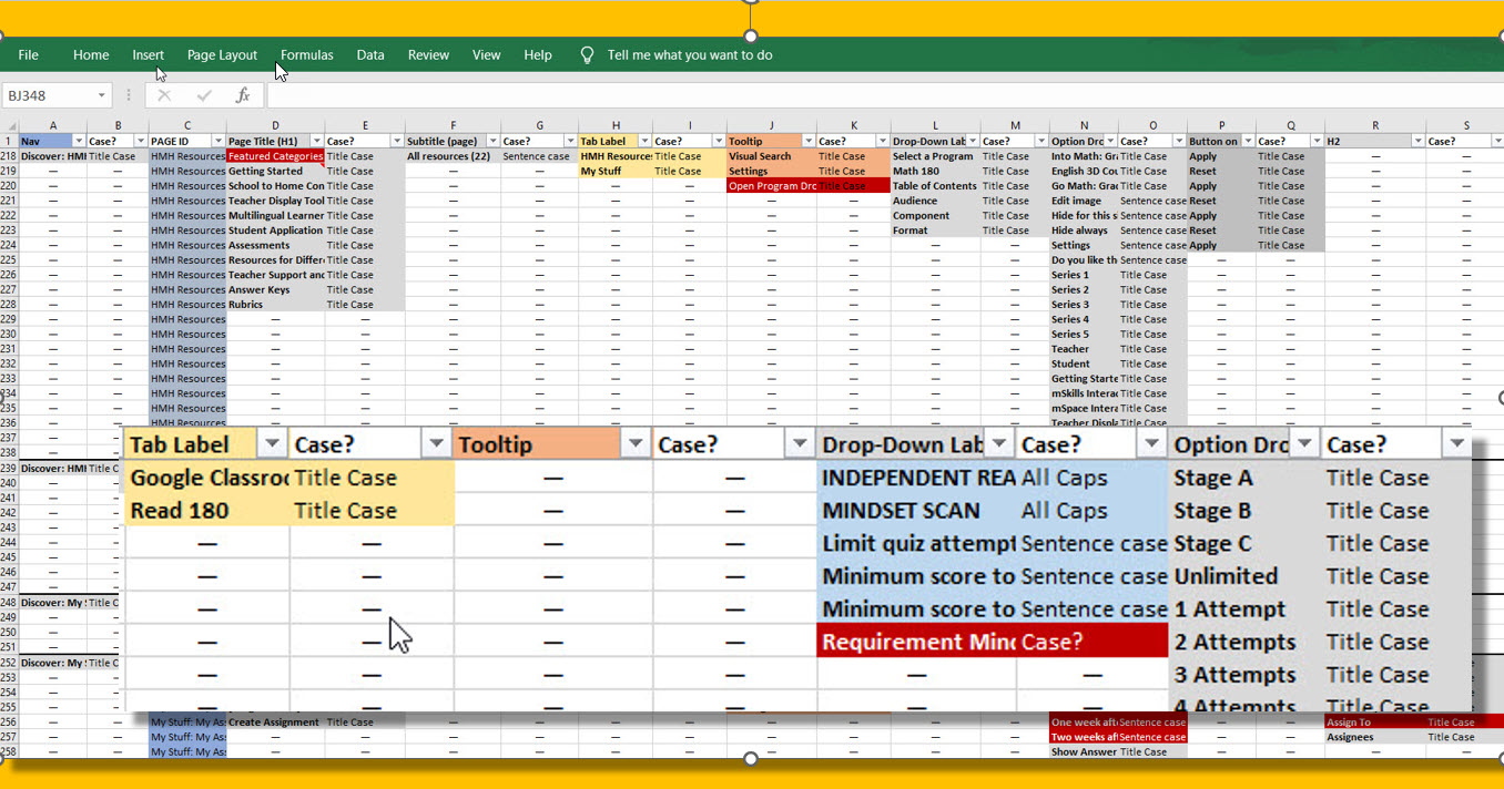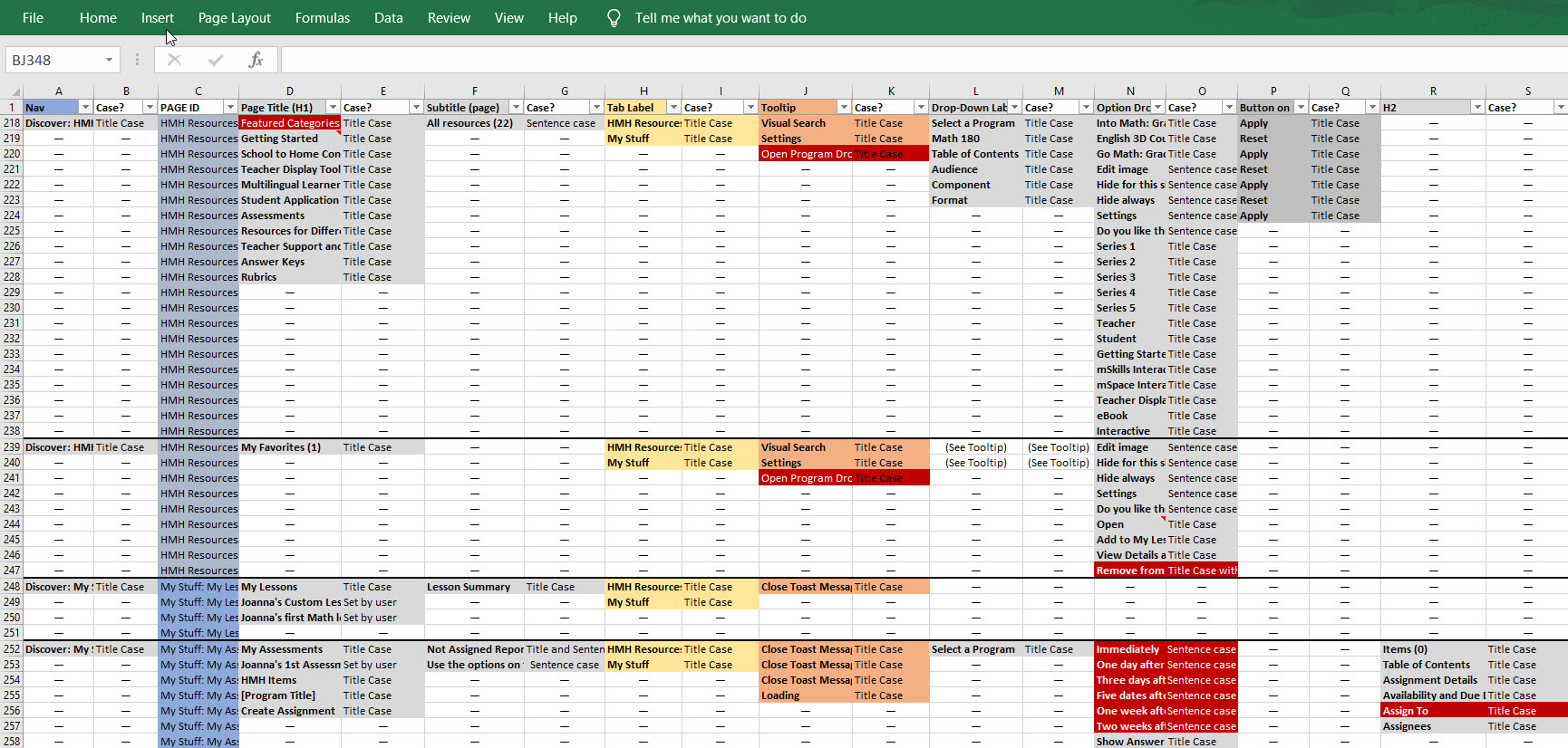 We wanted to know what capitalization conventions had been applied to the copy across the platform. I audited the copy and microcopy, noting both the current state and inconsitencies and errors. To share my findings, I created an Excel spreadsheet that showed the capitalization used on every screen, modal, popover, and tooltip in the platform. I used a color scheme to highlight inconsistencies, questions, and errors.