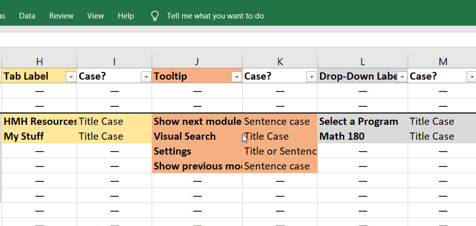 Spreadsheet columns showing capitalization findings for tab labels, tooltips, and drop-down labels