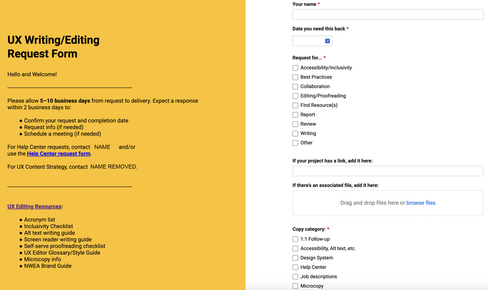 Second page of UX Writing/Editing Work Intake form