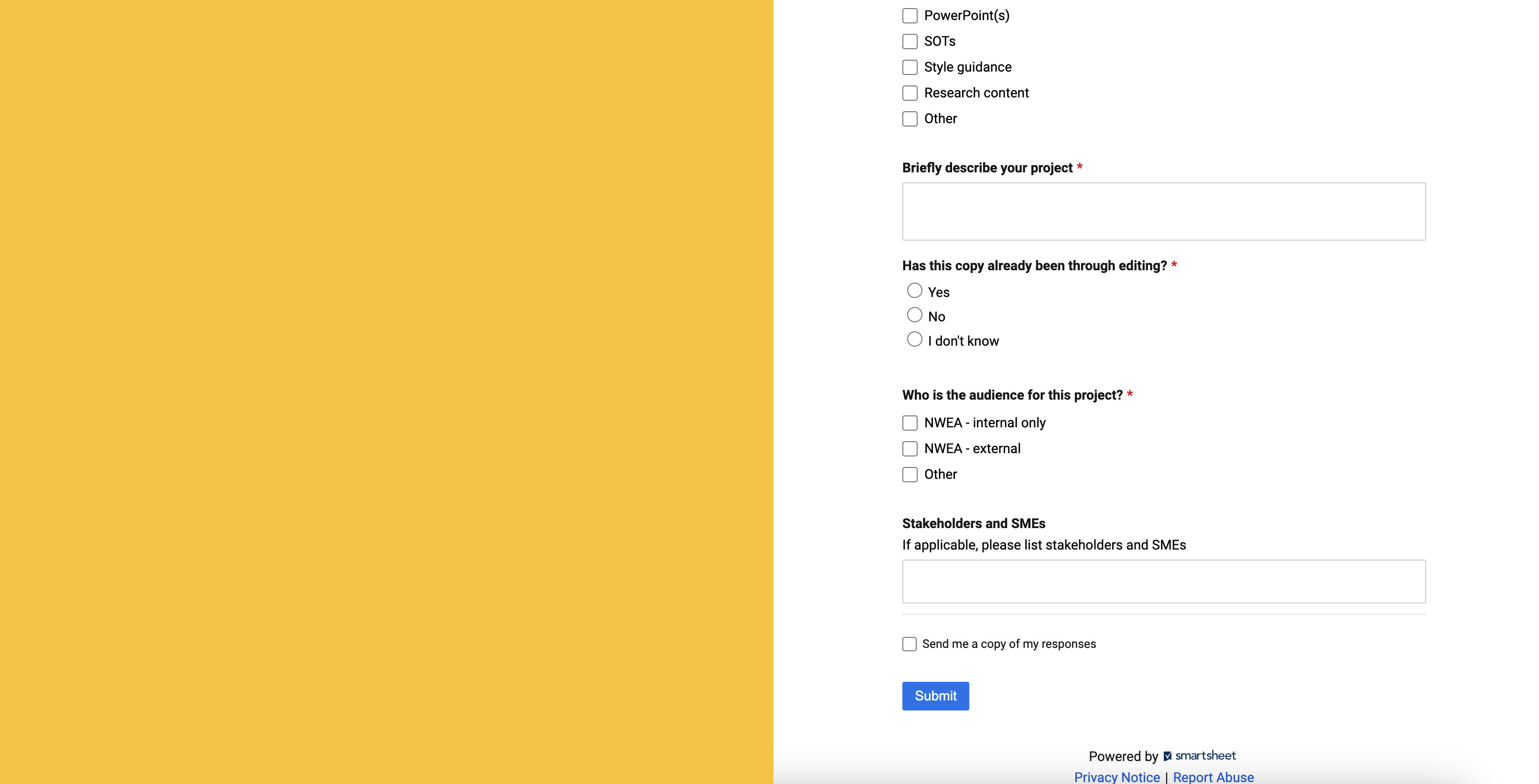 Writing/editing request form created with Smartsheet
